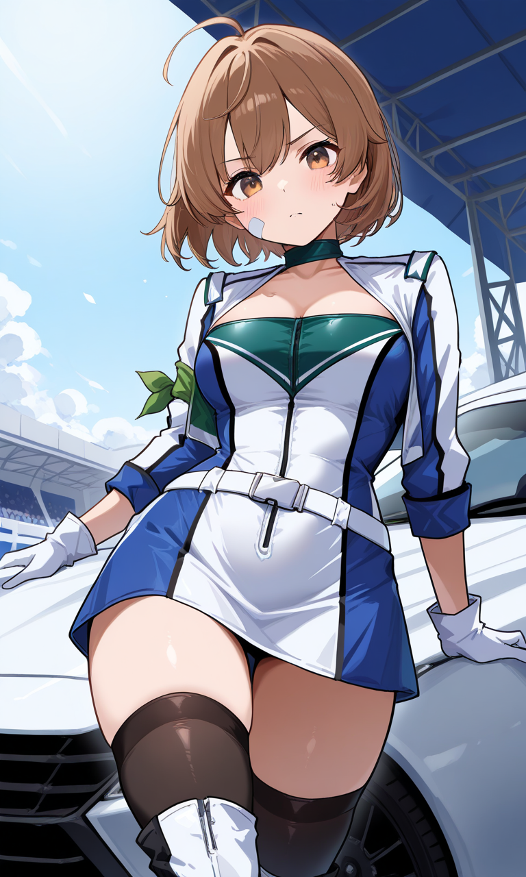 레이스 퀸 복장: obororqKC, 단발, 허벅지 양말, 드레스, ahoge, 부츠, 검은 허벅지 양말, 흰 장갑, 허벅지 부츠, 흰 재킷, 파란 재킷, 반창고, 다채로운 옷, 짧은 재킷, 얼굴에 반창고, 이톤 드레스, 레이스 퀸, 다채로운 재킷, 이톤 재킷, 흰 벨트,
