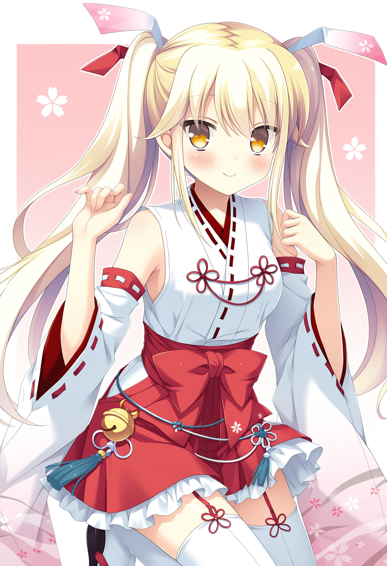 lora:Urara\_Illustrious+noobai-000004:1,Urara2,1girl,yellow eyes,blonde hair,detached sleeves,twintails,thighhighs,japanese clothes,sandals,miko,skirt,white thighhighs,ribbon trim,hakama,hakama skirt,ribbon-trimmed sleeves,nontraditional miko,wide sleeves,hakama short skirt,hair ribbon