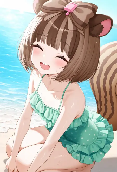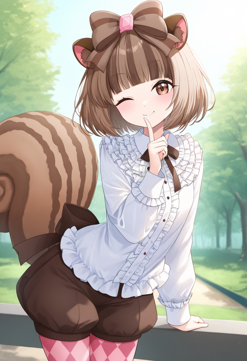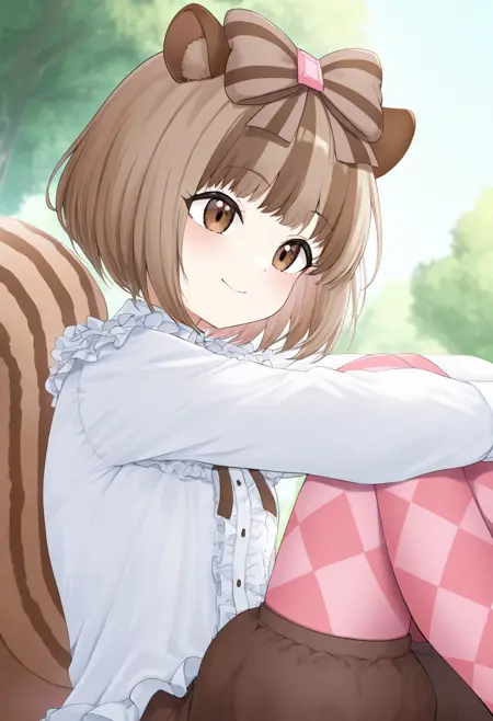 갈색 눈, 단발, 갈색 머리, 다색 머리, 머리 리본, 동물 귀, 다람쥐 꼬리, 다람쥐 귀,