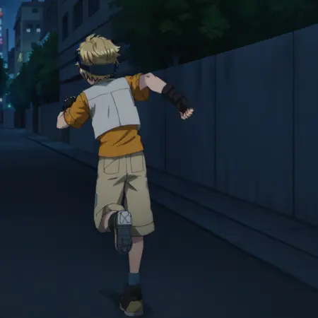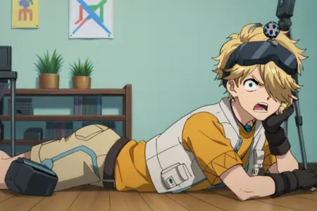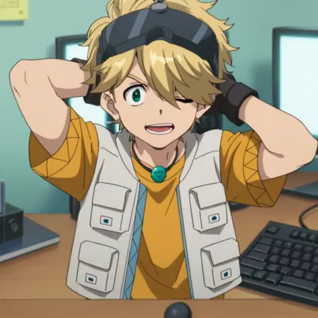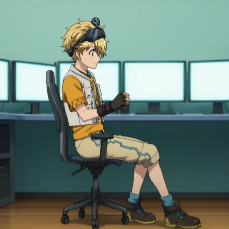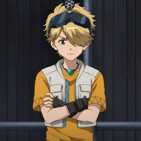 プロンプト: 男性、金髪、片目に髪をかけた、緑の目、ゴーグル、頭にゴーグル、ネックレス、ジュエリー、ベスト、オレンジ色のTシャツ、指なし手袋、短パン、青い靴下、靴、屋内(寝室/棚/箱/ポスター(物体)/本棚/観葉植物)、屋内(寝室/デスク/モニター/キーボード(コンピューター)/椅子)、屋内(倉庫/フェンス/階段)、屋外(街/木)