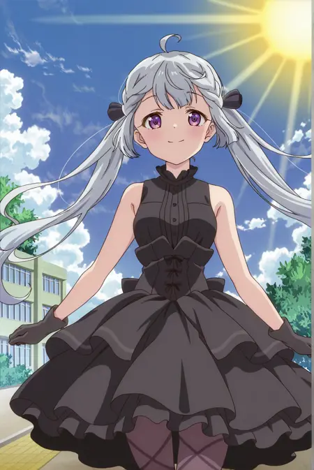 黑色礼服款:hakua-ber,休闲黑色连衣裙,1girl,银发,长发,双马尾,呆毛,发带,紫眼,无袖裙,无袖,高领,荷叶边,层叠裙摆,束身胸衣,黑色手套,丝袜,交叉系带袜子