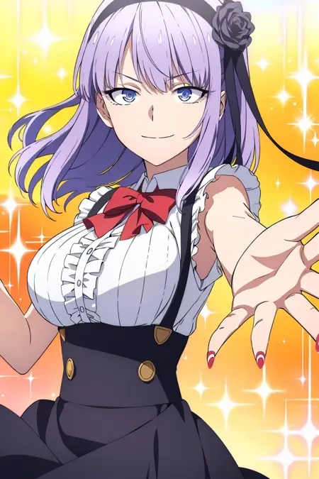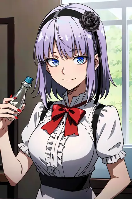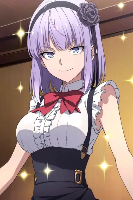 Hotaru, purple hair, hairband, ringed eyes, blue eyes, hair flower, hair ornament, short hair, breasts