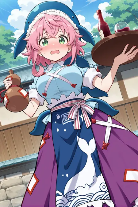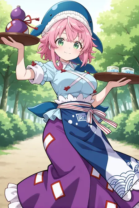 blue hat, whale hat, blue shirt, short sleeves, waist apron, blue apron, print apron, whale print, purple skirt, frilled skirt, ofuda on clothes,