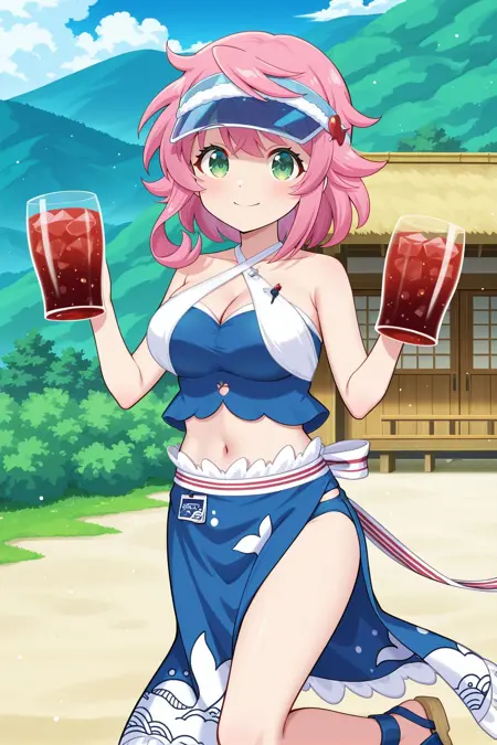 okunoda miyoi, 1girl, solo, green eyes, pink hair, medium hair, single sidelock, loose hair strand,, okunoda miyoi \(waitress of beach house kourindou\), alternate costume, visor cap, cleavage, white criss-cross halter, criss-cross straps, strapless, blue tube top, midriff, blue sarong, whale print, waist ribbon, striped ribbon, bikini under clothes, blue bikini, sandals, holding cup,