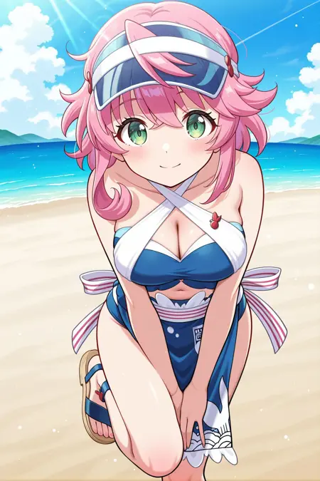 okunoda miyoi, 1girl, solo, green eyes, pink hair, short hair, okunoda miyoi \(waitress of beach house kourindou\), alternate costume, visor cap, cleavage, white criss-cross halter, strapless, blue tube top, midriff, blue sarong, striped waist ribbon, bikini under clothes, blue bikini, sandals,