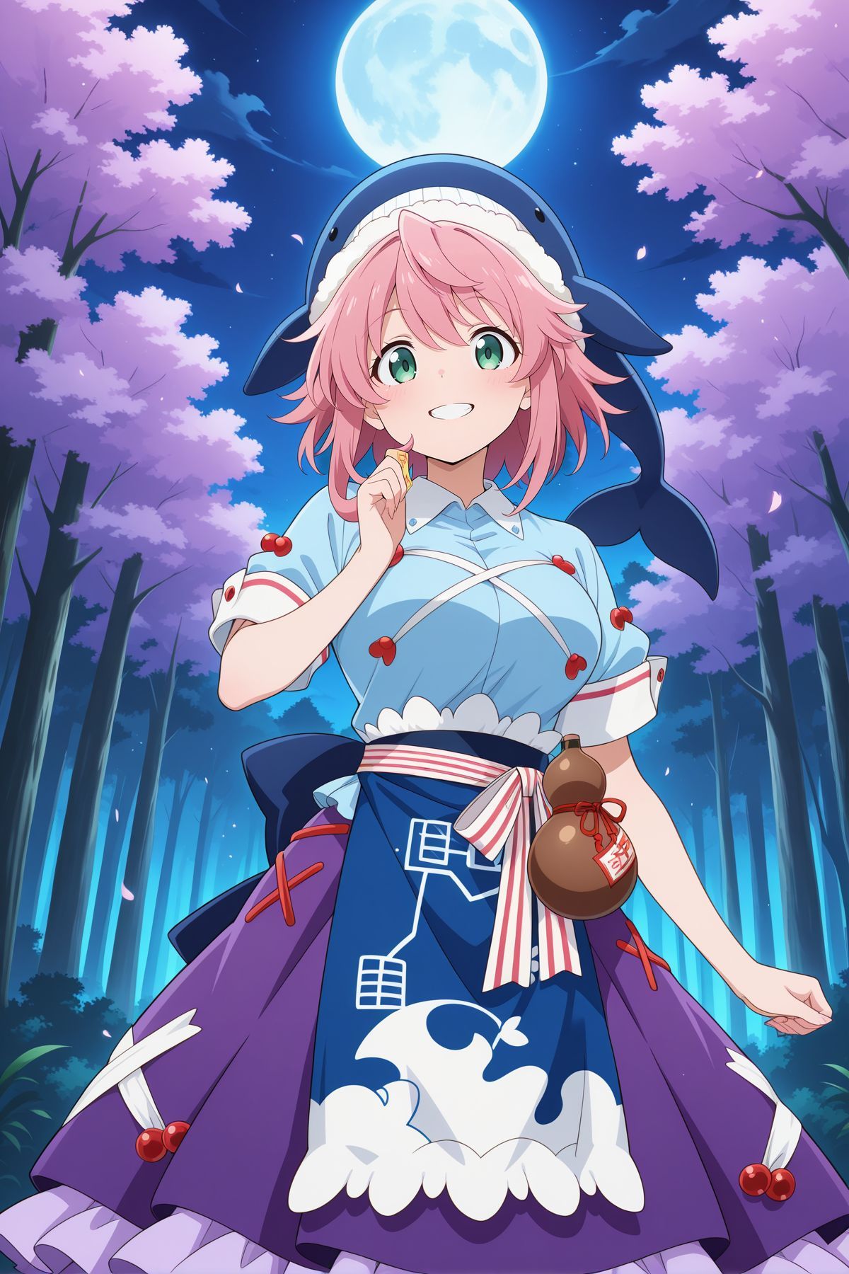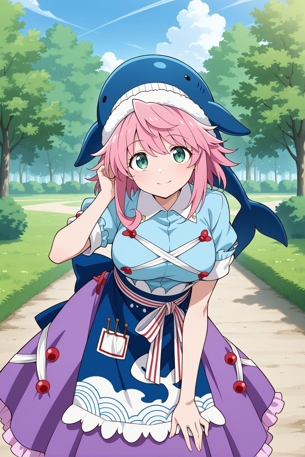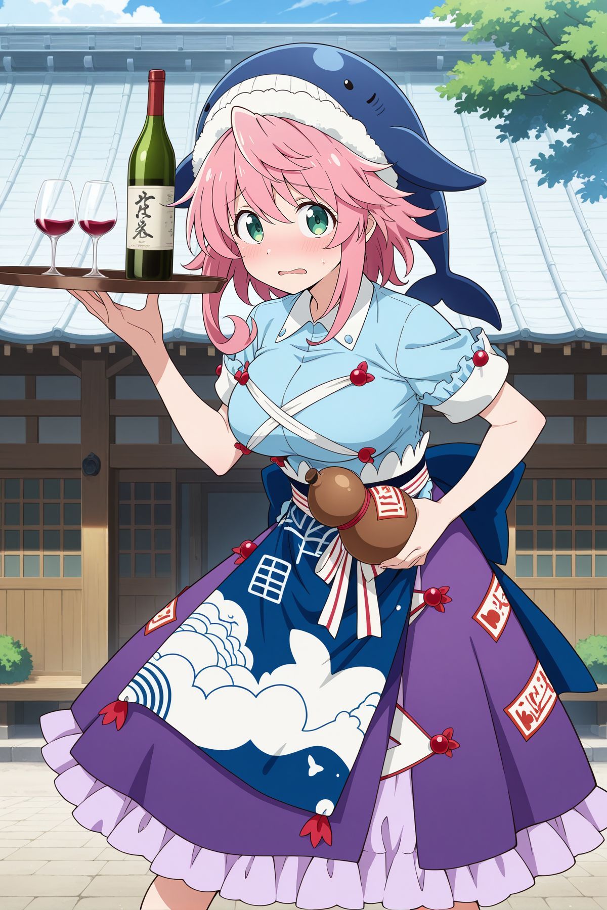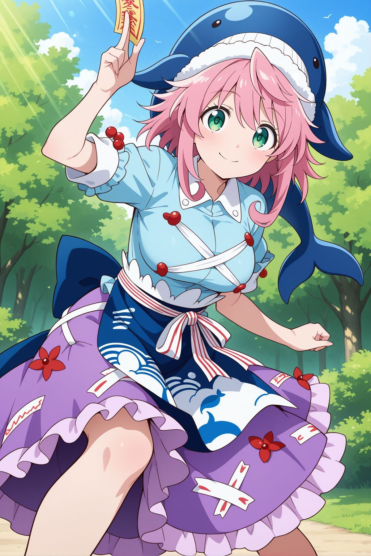 whale hat, blue shirt, short sleeves, waist apron, whale print, purple skirt, frilled skirt, ofuda on skirt,