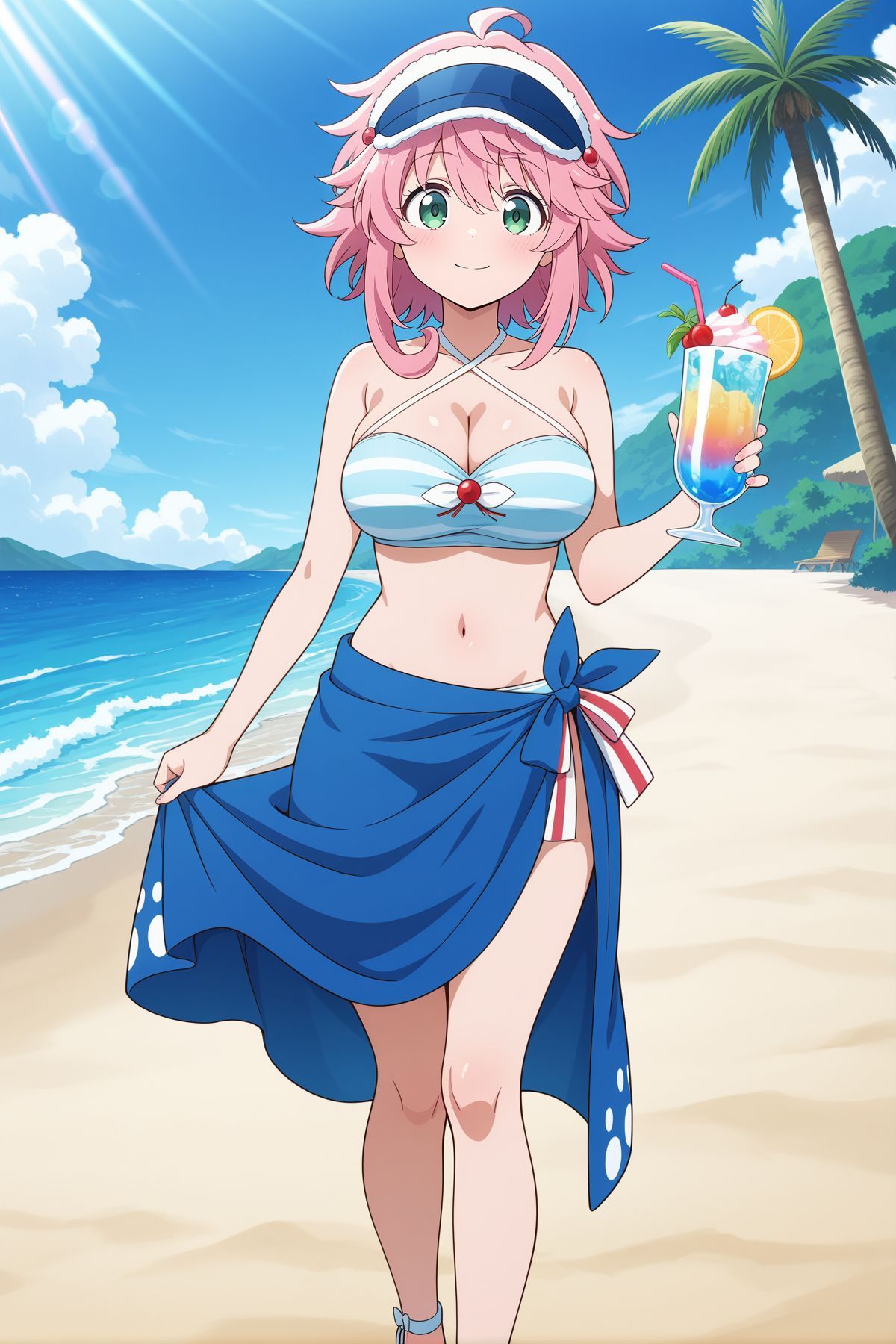 okunoda miyoi, 1girl, solo, green eyes, pink hair, medium hair, single sidelock, loose hair strand,, okunoda miyoi \(waitress of beach house kourindou\), alternate costume, visor cap, cleavage, white criss-cross halter, criss-cross straps, strapless, blue tube top, midriff, blue sarong, whale print, waist ribbon, striped ribbon, bikini under clothes, blue bikini, sandals, holding cup,