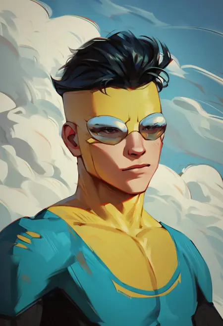Invinciblemc,skintight suit, yellow torso colored suit, yellow blue and black suit, black colored lower body suit,blue accents, blue collar suit, yellow fingerless gloves, blue boots, knee boots,yellow facemask, white glossy Goggles, opaque glasses,