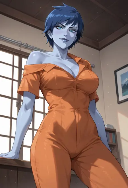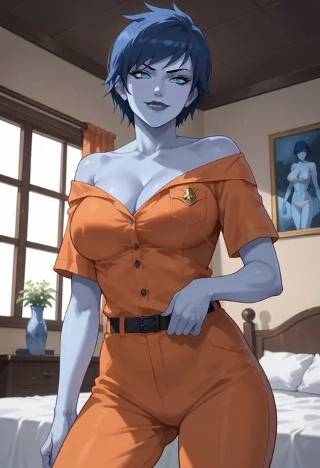 score_9_up, score_8_up, score_7_up, dc comics, 平涂色彩, 1个女孩, 凶杀霜, 短发, 蓝发, 蓝色皮肤, 胸部显露, 手套, 单人, (黑色紧身裤, 蓝色上衣, 中间敞开, 蓝色手套, 男孩气, 单人, 白色毛边手套, 无肩带, 无袖, 蓝色皮肤, 精细眼睛, 彩色皮肤, 裸露肩膀, 露肩, 蓝色紧身衣, 黑色紧身裤, 大腿, 巨大乳房, 成熟女性, 蓝色皮肤, ) 露肩, 蓝色皮肤, 精细眼睛, 彩色皮肤,