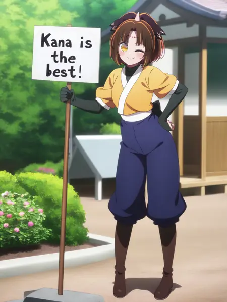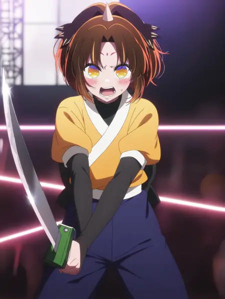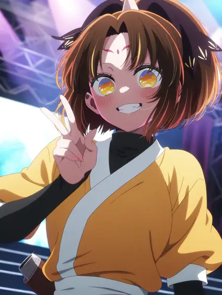masterpiece,best quality,amazing quality, Arima_Kana_Tsurugi, 1girl, solo, brown hair, yellow eyes, ponytail, hair ornament, forehead mark, parted bangs, single horn, yellow top kimono, blue pants, short sleeves, black elbow gloves