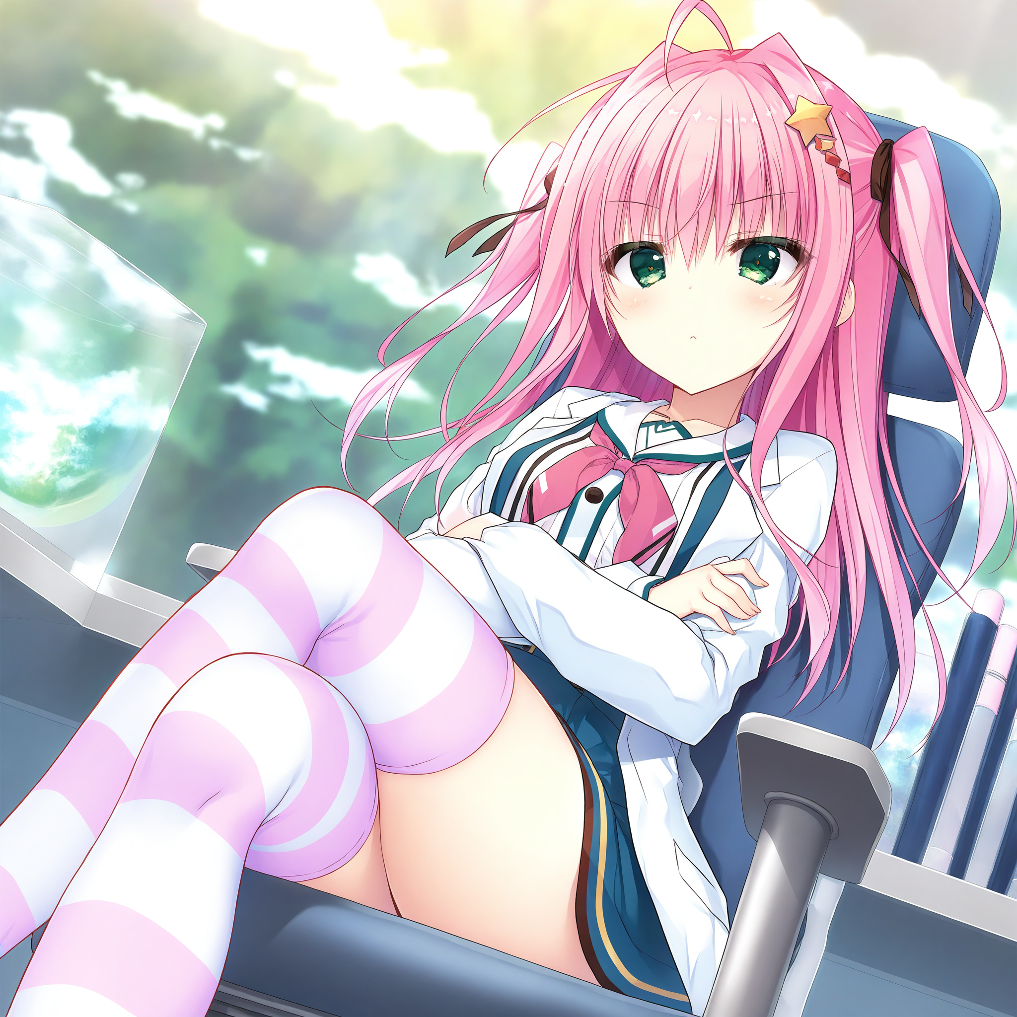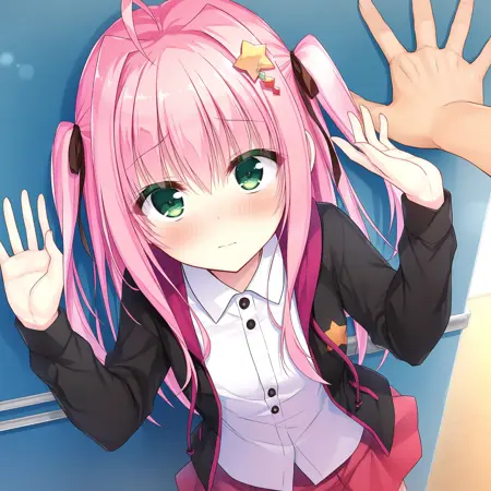 Kukuru,pink hair,short hair,two side up,green eyes,star \(symbol\),star hair ornament,hair ribbon,black ribbon,