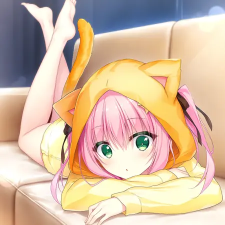 yellow pajamas,barefoot,animal hood,animal ears,cat tail,cat ears,hoodie,hood up,cat hood,long sleeves,bare legs,fake tail,