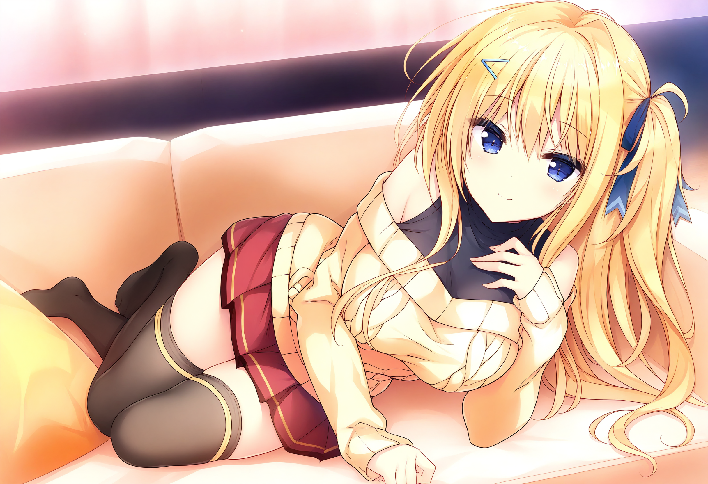 black thighhighs,red skirt,breasts,long sleeves,zettai ryouiki,miniskirt,off shoulder,pleated skirt,collared shirt,sleeves past wrists,off-shoulder sweater,bare shoulders,yellow sweater,black shirt,