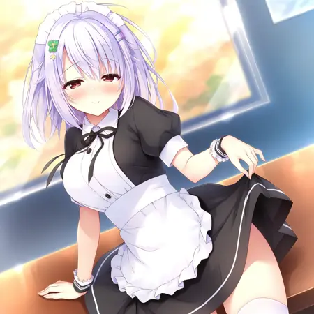 maid,white thighhighs,white apron,short sleeves,frilled apron,maid headdress,black ribbon,frills,neck ribbon,maid apron,wrist cuffs,puffy sleeves,puffy short sleeves,collared dress,white collar,pleated dress,detached collar,wing collar,zettai ryouiki,short dress,black skirt,black dress,