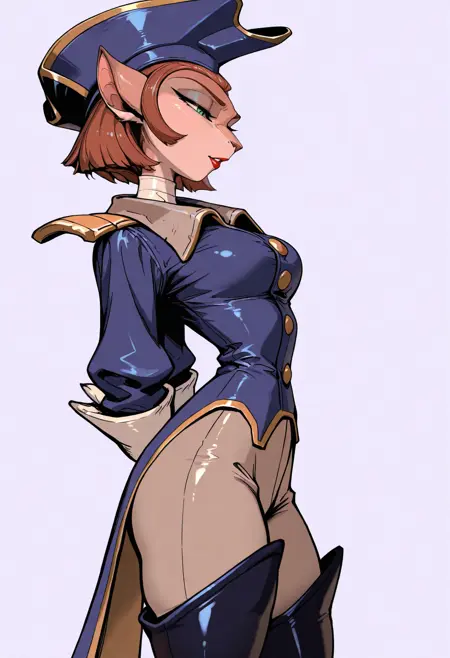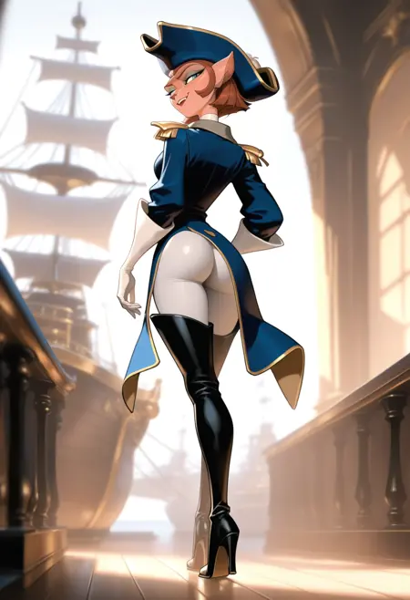 衣装タグ: 帽子, 青い頭部装備, ハイネック, 白いハイネック, ユニフォーム, ジャケット, 長袖, 肩章, テールコート, 手袋, 白い手袋, パンツ, 白いパンツ, ブーツ, 太ももブーツ, 黒い履物, ハイヒール, ハイヒールブーツ,
