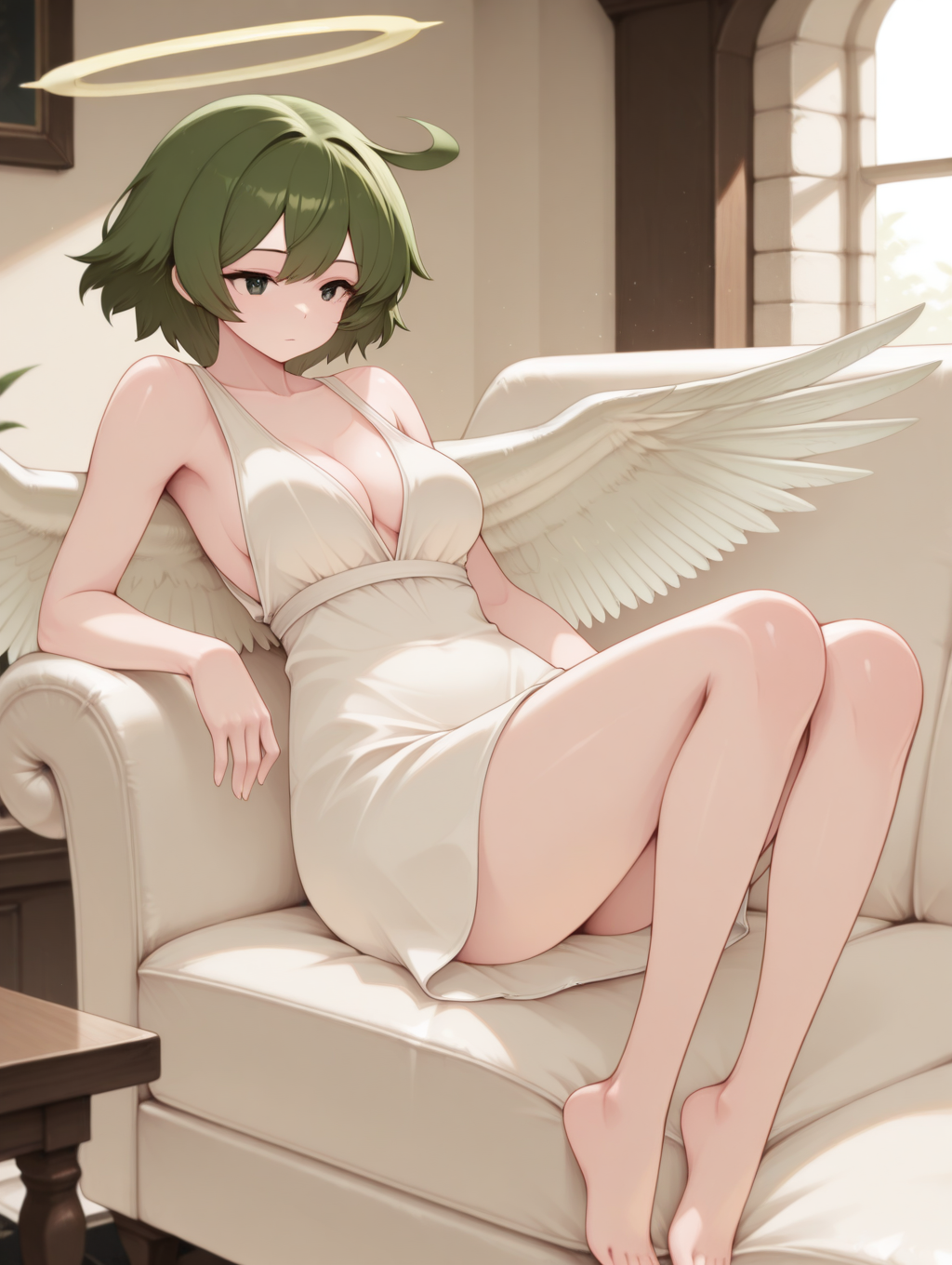 VetAngel,短发,绿发,呆毛,绿眼,光环,翅膀,天使,中等乳房,连衣裙,白色连衣裙,(吊带裙),露肩,乳沟,