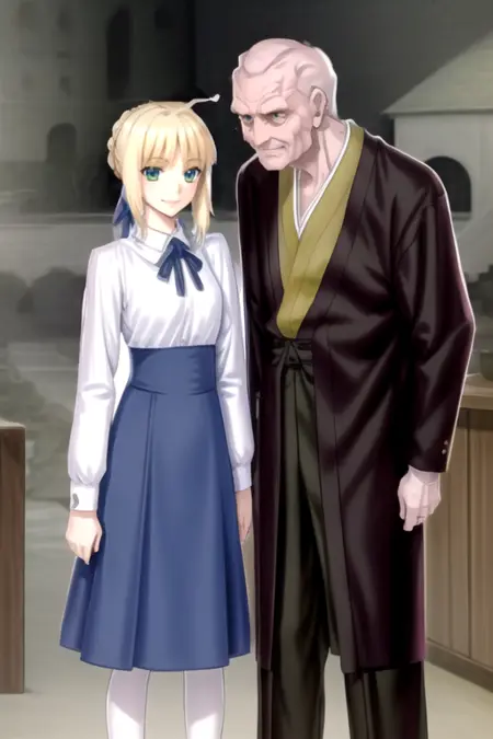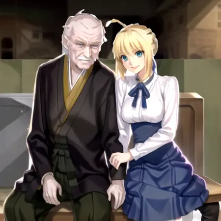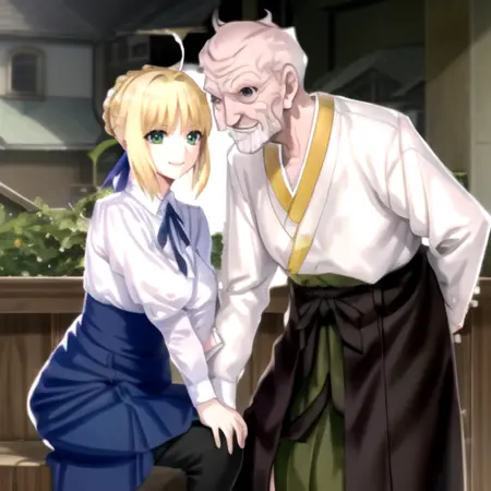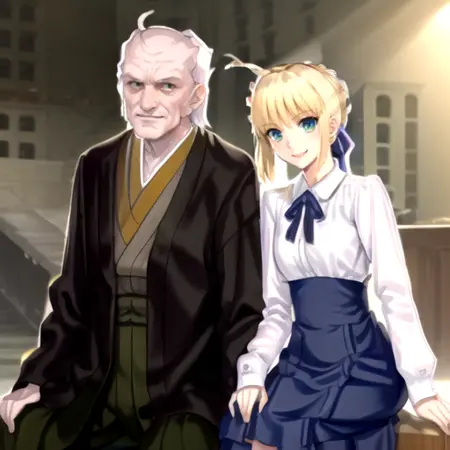 ZoukenArtoria, an old man and a woman, hetero, standing, smile, cowboy shot