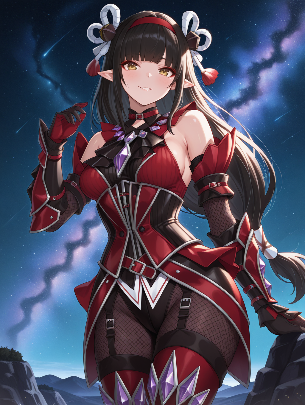 태그(의상 - 빨강): 빨간 탑햇, 빨간 벨트 칼라, 빨간 갑옷 드레스, 빨간 코르셋, 빨간 갑옷 장갑, 기터 스트랩, 빨간 갑옷 부츠,