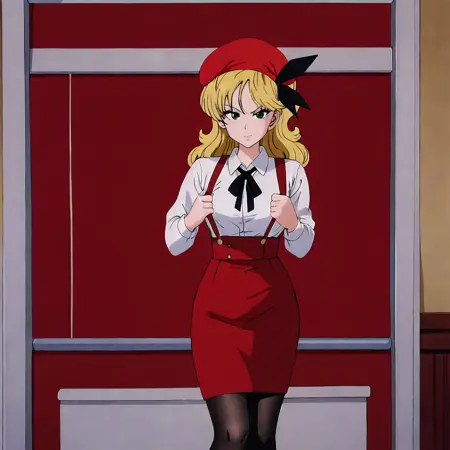 금발 + 검은 바지 트리거: LaunchBlondeBlackPants, blonde hair, 1girl, brown gloves, crop top, midriff, medium breasts, long hair, hairband, curly hair, navel, collarbone, retro artstyle, bare shoulders, hair ribbon, skirt, cleavage, cowboy shot