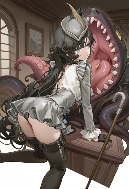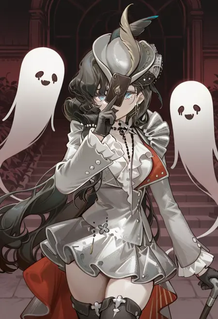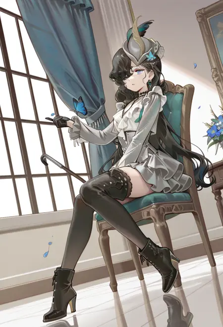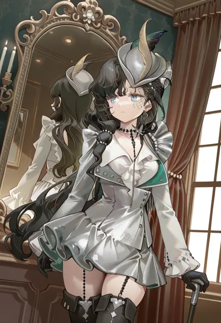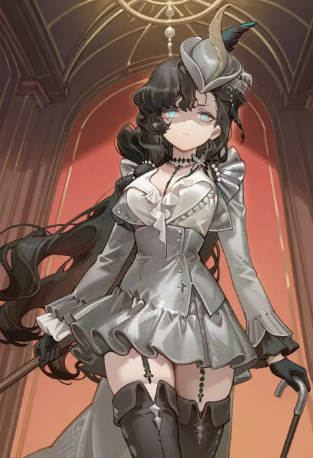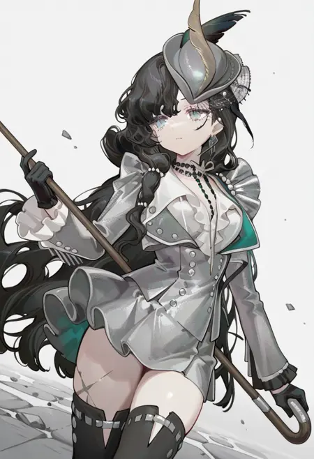 white shirt,cane,thighhighs,shirt,long sleeves,jewelry,hat feather,black gloves,weapon,frills,
