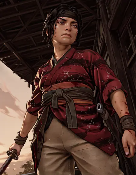 红色和服或红色长袍,黑色头带,米色长裤-靴子或凉鞋,