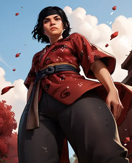 red kimono, or red robe, black headband, beige pants- boots or sandals, -
