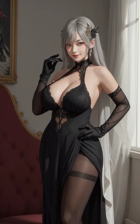 hades, very long hair, hair between eyes, red eyes, gloves, long dress, cleavage, bare shoulders, grey hair, pantyhose, black gloves, elbow gloves, black footwear, high heels, black pantyhose, two-tone dress, hair ornament,