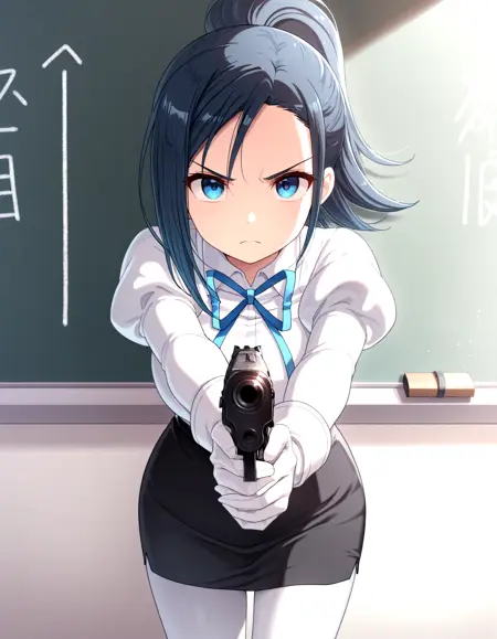 그녀의 평소 외모를 위한 기본 프롬프트: koidara_annehappy, blue_ribbon, skirt, white_gloves, white pantyhose, sleeve_cuffs, closed_eyes