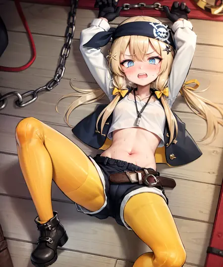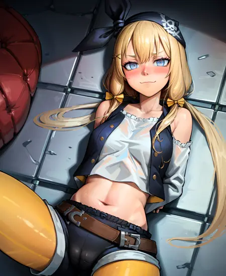 -Obviously, the detailed custom sword/skull emblem on her bandana is not going to come through very well