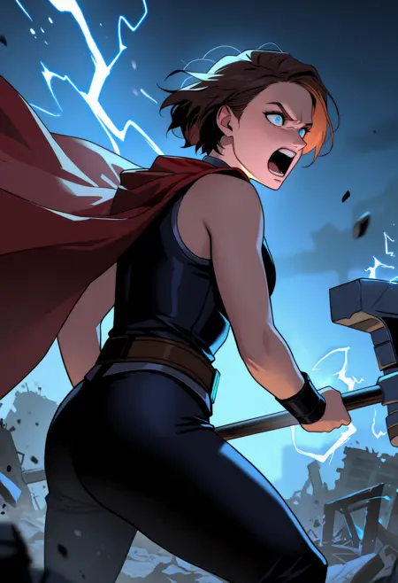 衣装タグ: 青いタンクトップ、白いインナー、ノースリーブ、肩の露出、ショルダーホルスター、懐中電灯、ペンダント、片肘パッド、黒い手袋、指なし手袋、黒いベルト、ベルトポーチ、警察のバッジ、黒いズボン、太ももホルスター、コンバットブーツ