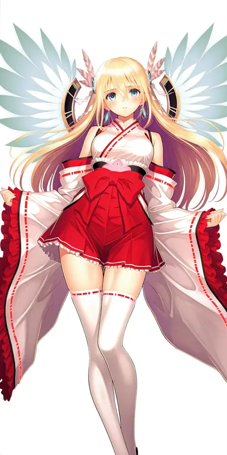 Minerva,tony taka,japanese clothes,miko,hakama short skirt,hair ornament,thighhighs,earrings,detached sleeves,wide sleeves,wings,