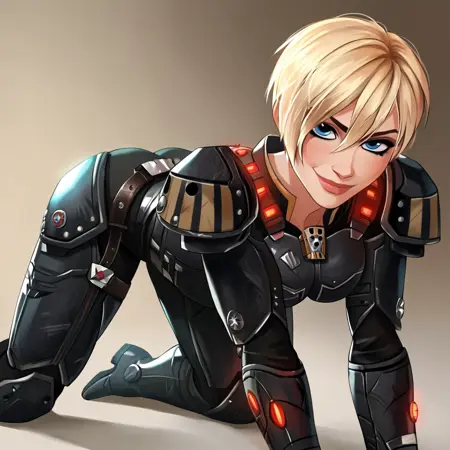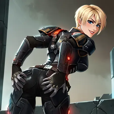 Sergeant_Calhoun, 1girl, solo, blonde hair, short hair, blue eyes, armor, power armor, belt