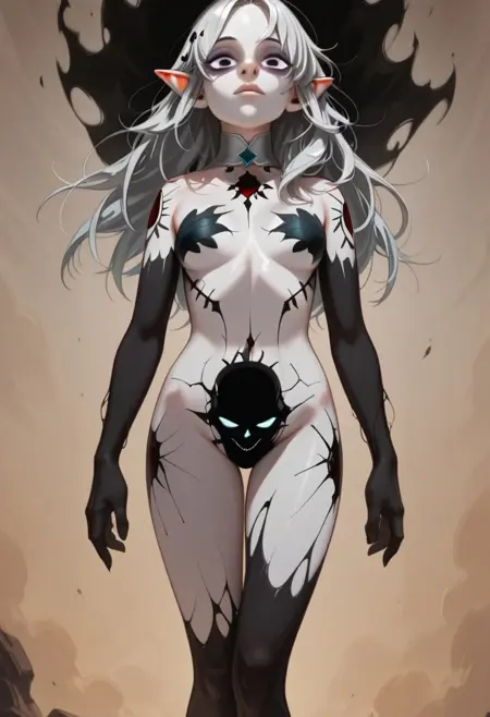 Vaelithra,心智破碎的精灵,蓝色眼睛,高贵的精灵面容,高颧骨,尖下巴,纤细体态,长发,银发,裸体,乳房,苍白的乳晕和乳头,黑色双手,黑色腹股沟,黑色双脚。
