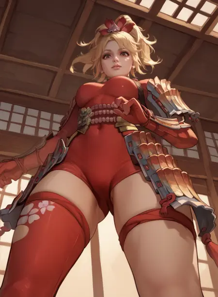 일본 갑옷, 빨간 바디수트, 다리, 머리 장신구, 장갑, 허벅지 스트랩, 부츠,