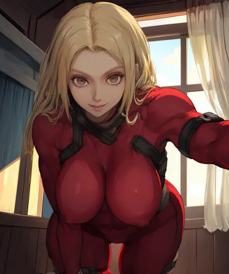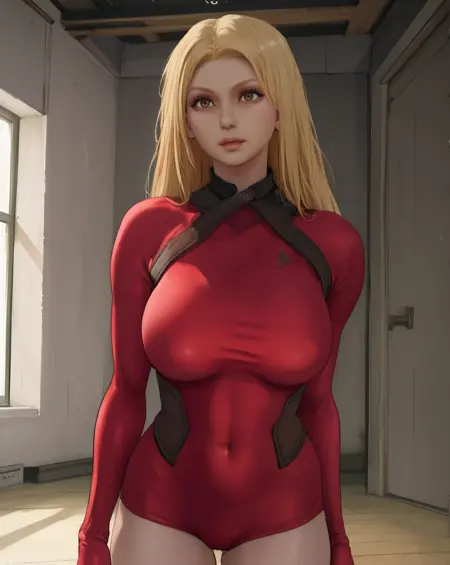 japanese armor, red bodysuit, legs, hair ornament, gloves , thigh strap, boots,