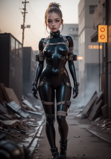 post apocalyptic landscape, (1 girl, latex bodysuit, large breasts, full body), (shallow depth of field, bokeh, lens blur:1.1), dust, bloom
