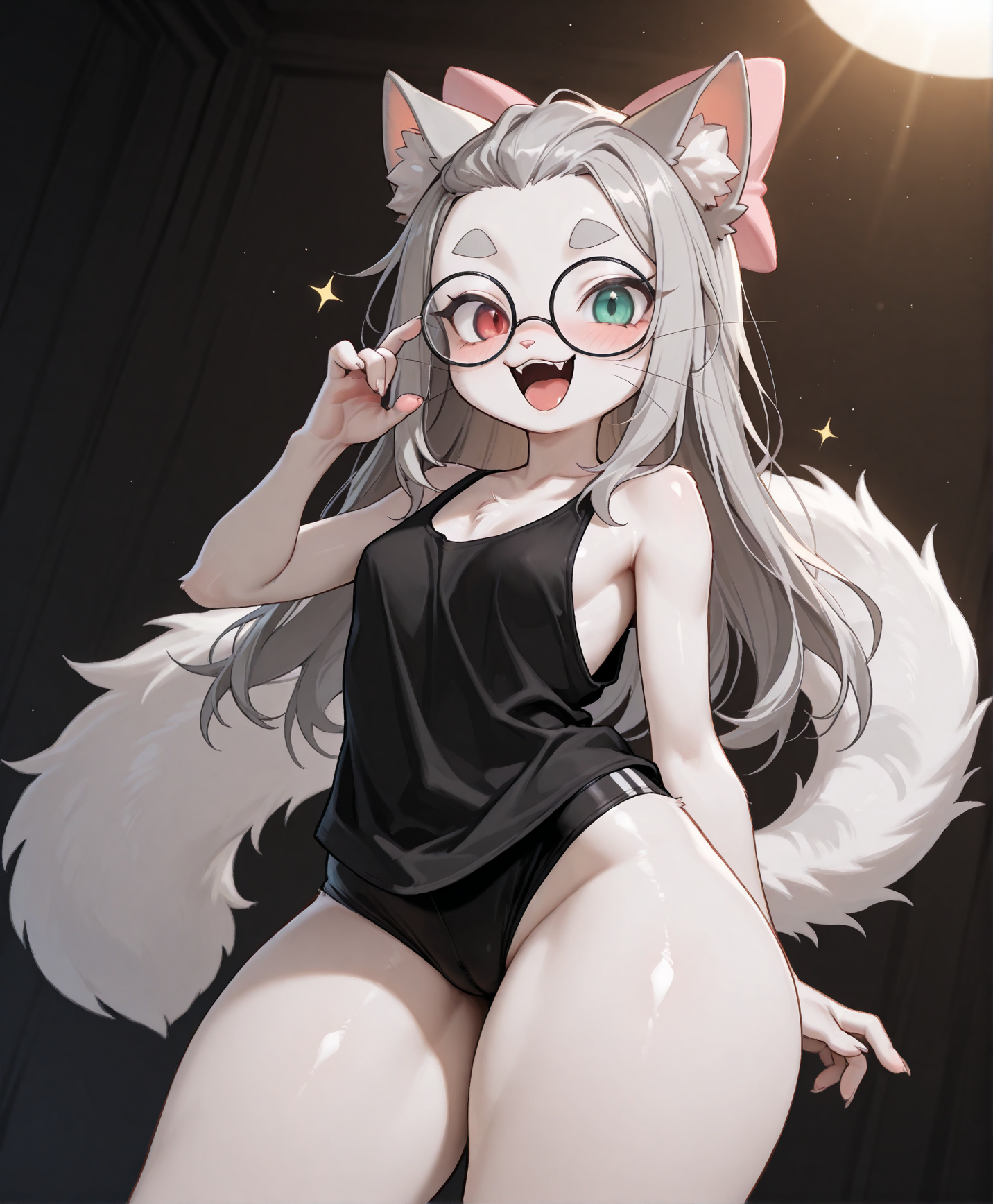 :s0na, 异色瞳, ahthro, 女性, 兽人, 白色毛发, 蓬松尾巴, 粉色蝴蝶结,