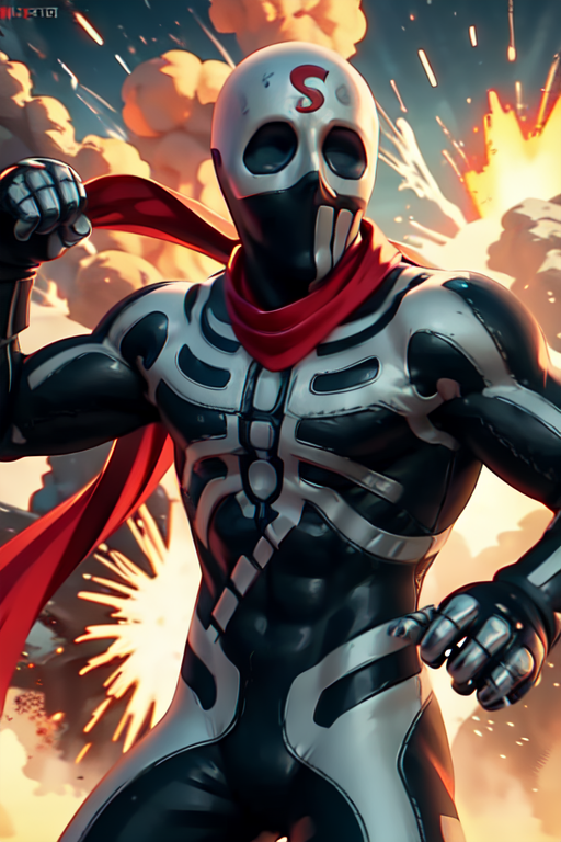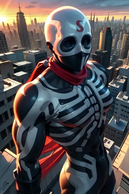 Skullomania, bodysuit, skin tight, red scarf, S on forehead,