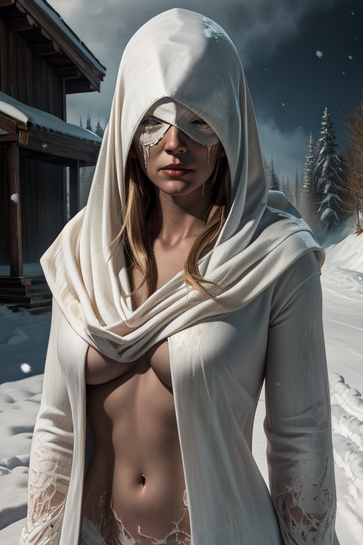 white robe, navel, white hood, long long sleeves, eyes covered,