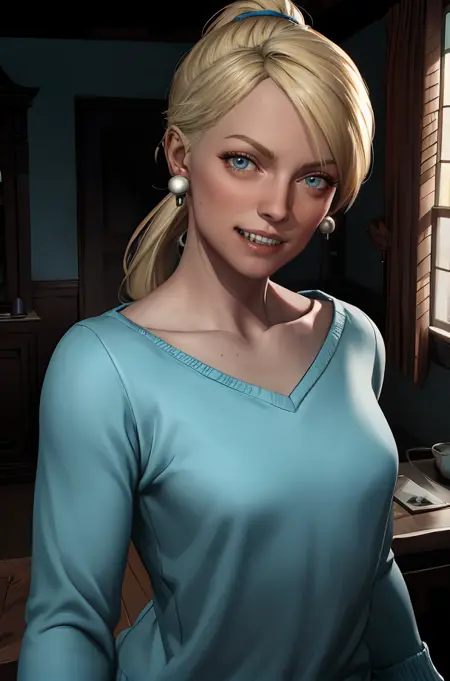 파란 스웨터, 바지, 작은 귀걸이, 하이힐,