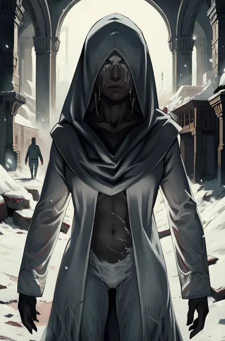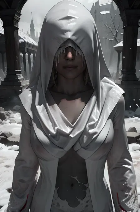 흰색 로브, 배꼽, 흰색 후드, 긴 긴 소매, 눈이 가려짐,