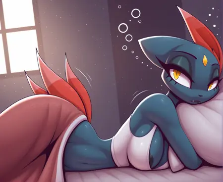 1girl, furry, female, 额头宝石, 黄色眼睛, 黑色瞳孔, 竖瞳, 深蓝色皮肤, 尾巴, 黑色口红, 红耳