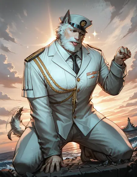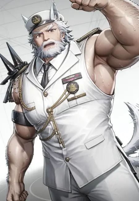 pnch_sls, hat, beard, facial hair, white hair, animal ears, necktie, uniform, furry male, muscular, tail