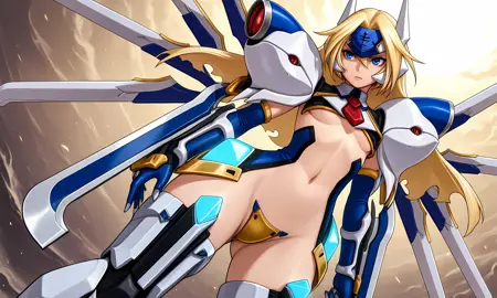 mu-12, bbmu12, mu12bb, blonde hair, blue eyes, forehead protector, crotch plate, headgear, arm blade, clothing cutout, pauldrons, revealing clothes, armor, shoulder armor, mechanical legs, floating weapon, mecha musume, thighs, maebari