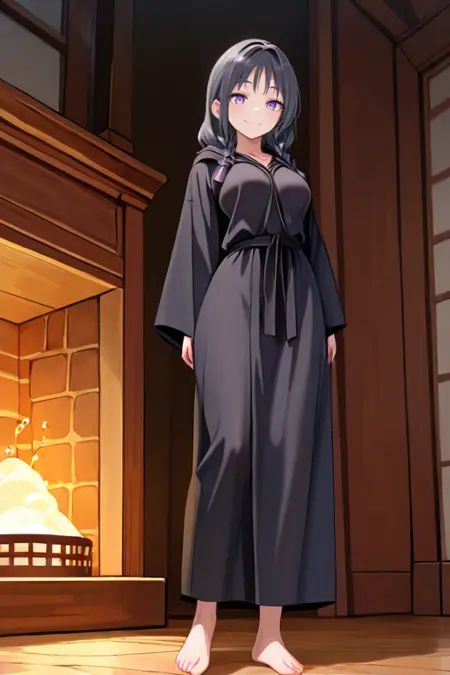 medium breasts, sakind, long sleeves, black robe, hooded robe, naked cloak, collarbone, nipples, navel, barefoot,