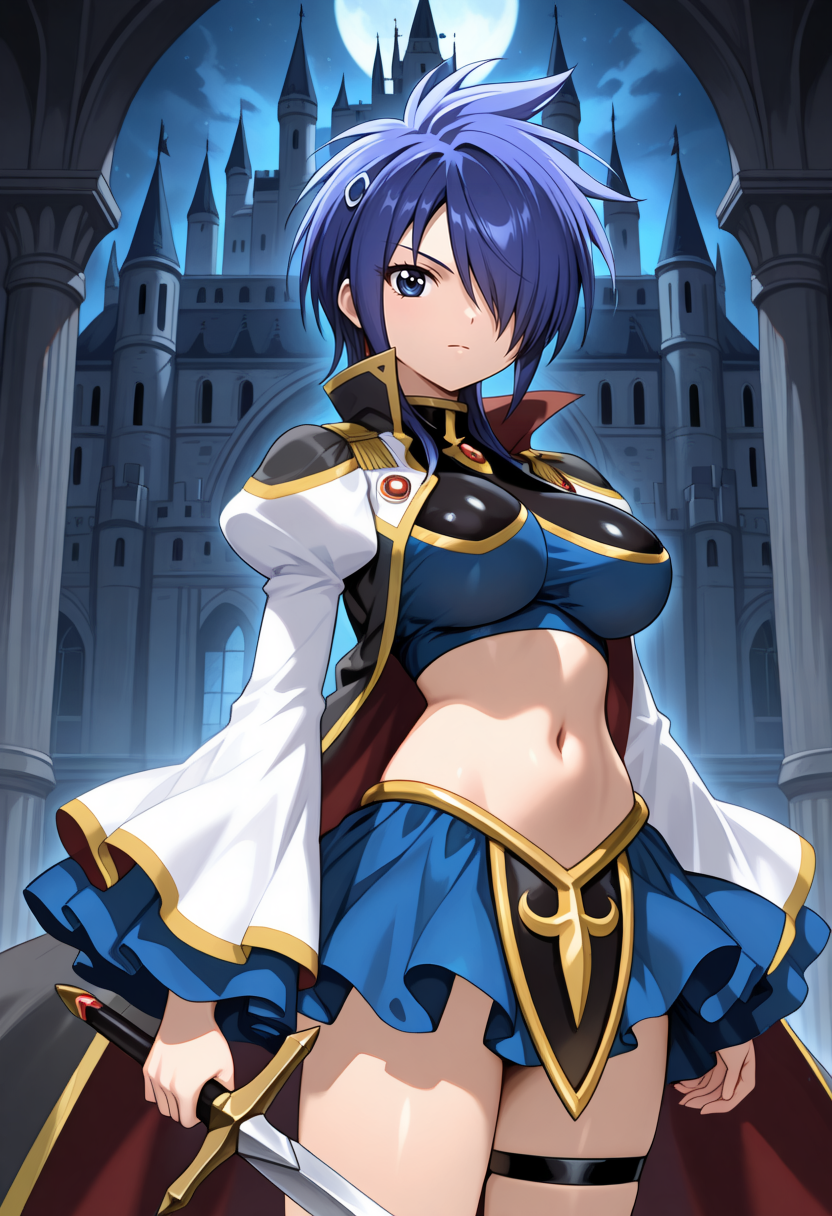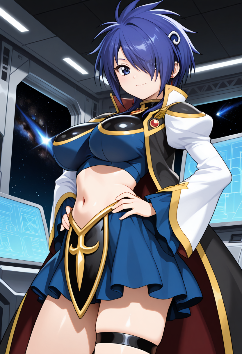 military uniform, puffy sleeves, wide sleeves, navel, blue skirt, single thigh strap, black cape, large breasts, dark blue hair, spiked hair, hairclip, hair over one eye, dark blue eyes