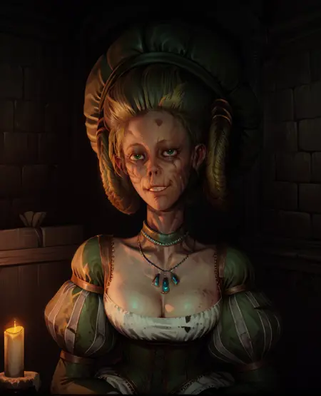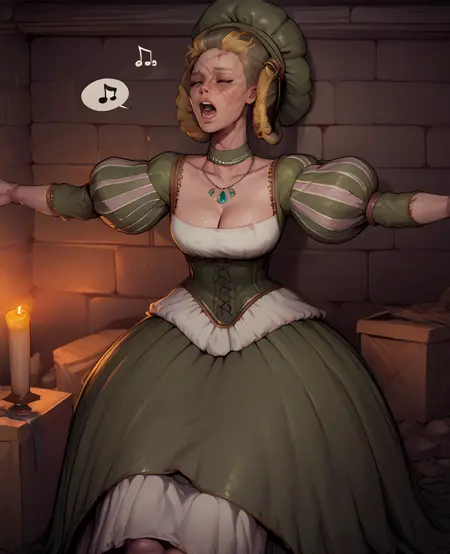 蓬松袖子或朱丽叶袖,绿色连衣裙,束腰,帽子,胸脯显露,绿色项圈