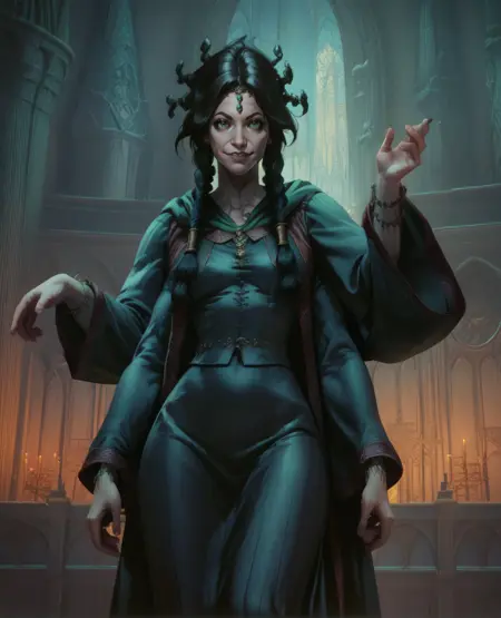 fool, 검은 머리, 녹색 눈, 쌍둥이 땋은 머리 또는 땋은 머리 - 떠 있는 머리카락