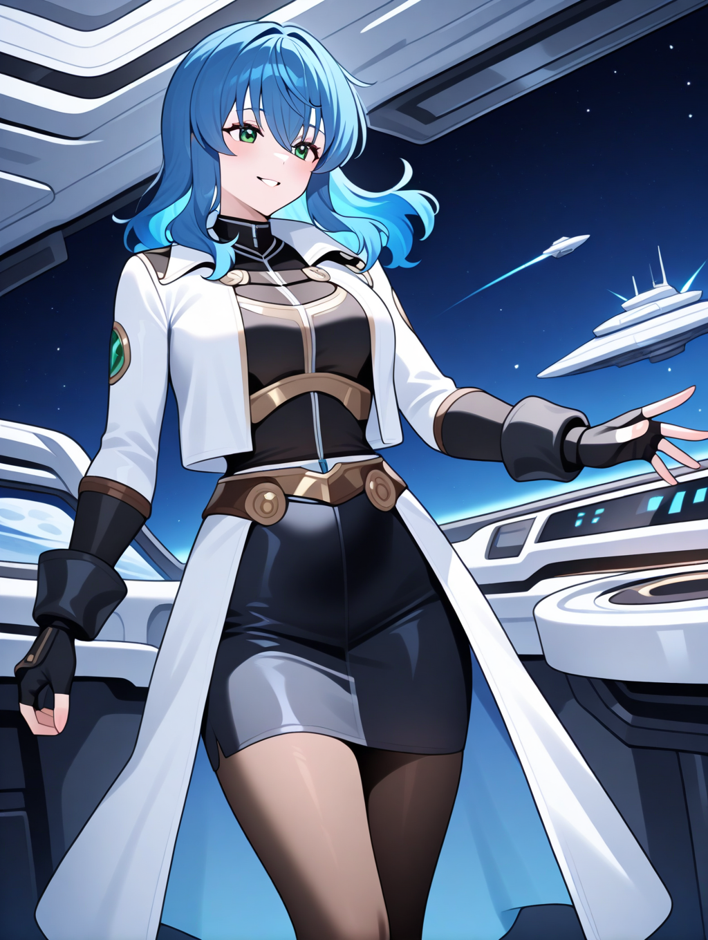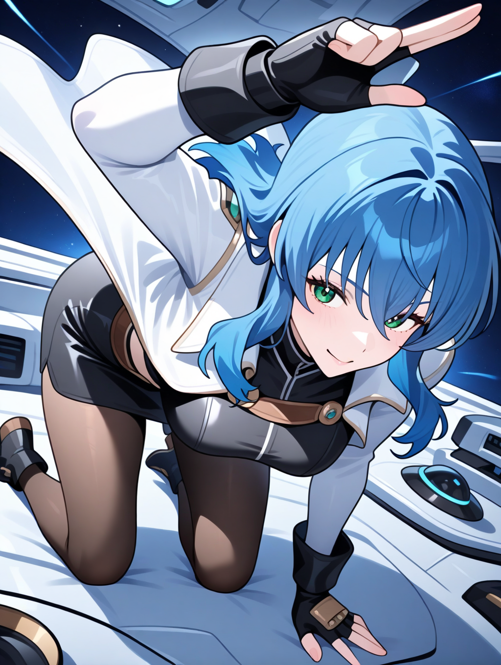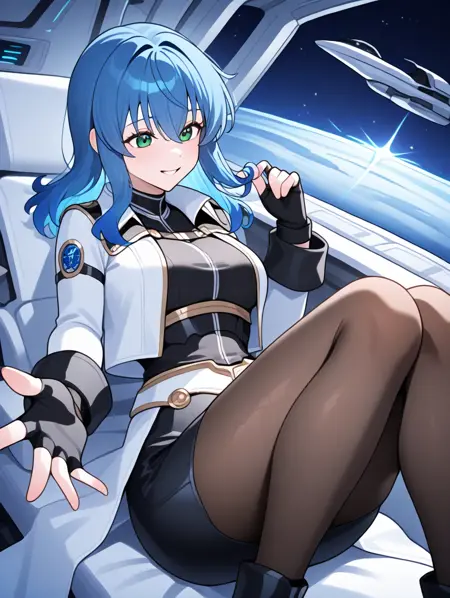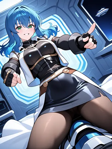 提示示例:maria,solo,green eyes,fingerless gloves,blue hair,open jacket,black pencil skirt,pantyhose,black shirt,black long sleeves,separate white coat,breasts plate,space ship,indoors,