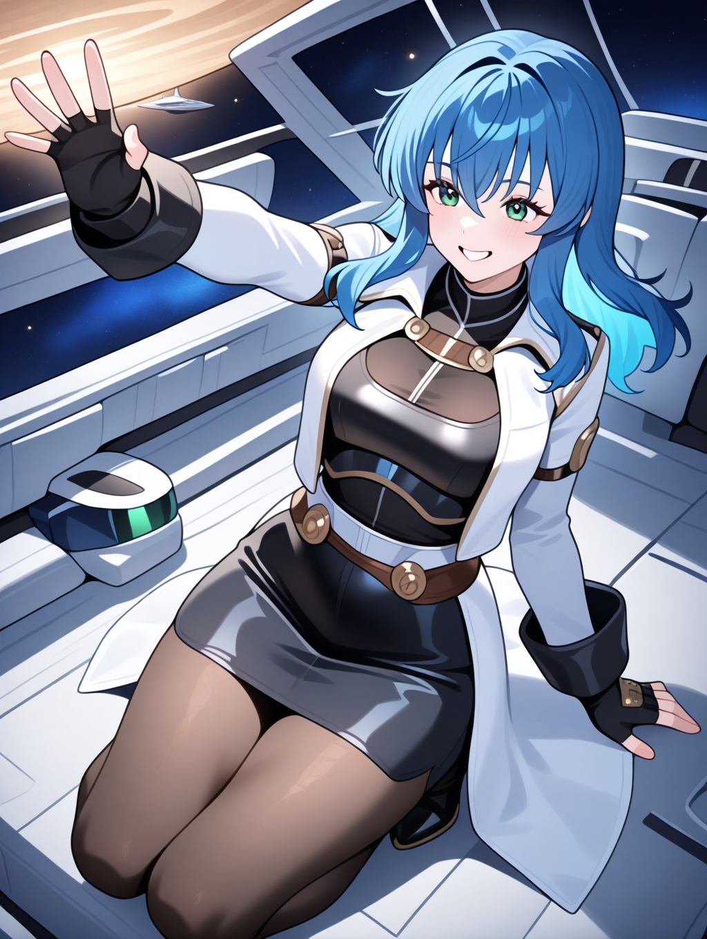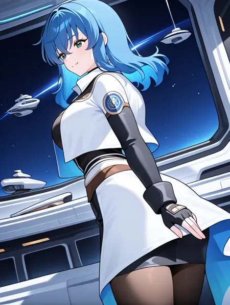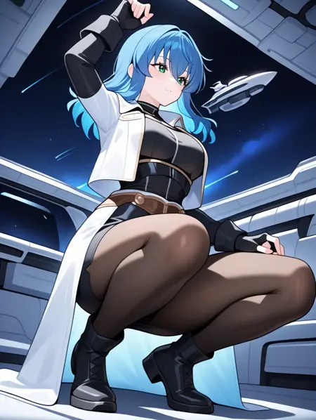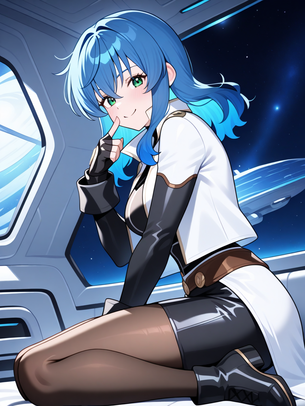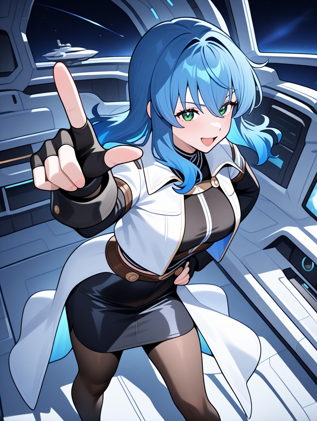 提示示例:maria,solo,green eyes,fingerless gloves,blue hair,open jacket,black pencil skirt,pantyhose,black shirt,black long sleeves,separate white coat,breasts plate,space ship,indoors,
